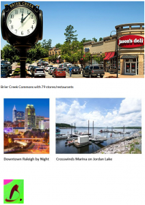The Brier Creek Country Club (shown in pink) is the heart of the Brier Creek Area and has four major Active Adult communities (red stars). Active Adults also enjoy the proximity to the greater recreational and cultural offerings nearby. Briar Creek is minutes to the Raleigh/Durham airport, Research Triangle Park, Jordan Lake, Falls Lake, Duke University, NC State University, University of North Carolina Chapel Hill, and several top hospitals in the US including Duke. It is also just 2 hours from the beach and 3 hours from the Appalachian Mountains. Please give me a call if I can answer any questions for you.